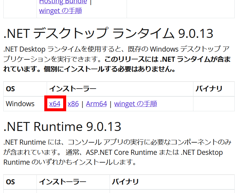 「.NETデスクトップランタイム 9.0.13」の欄にある「x64」をクリック。
