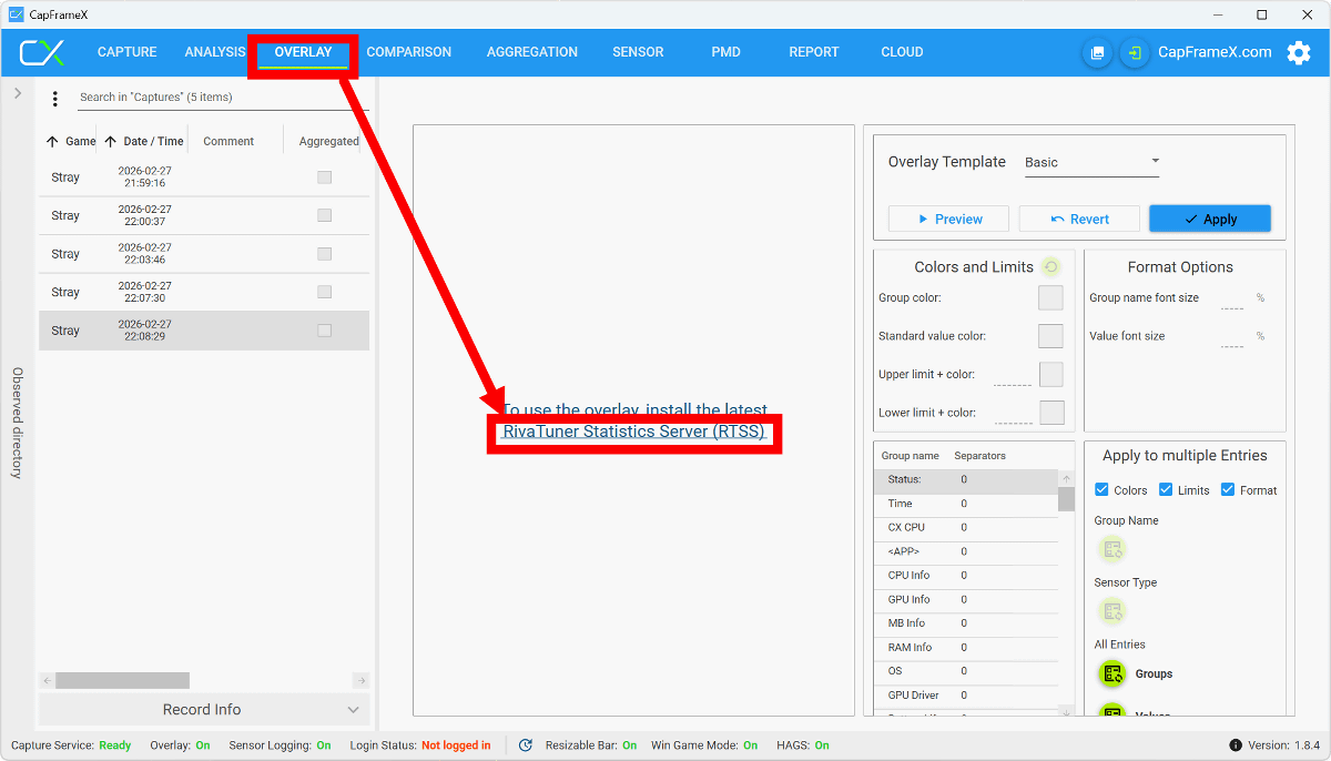 CapFrameXは外部アプリのRivatuner Statistics Server(RTSS)と連携することで測定結果をゲーム画面の上にオーバーレイ表示できます。まず、RTSSをインストールするためにCapFrameXの画面上部のOVERLAYをクリックしてから「Rivatuner Statistics Server(RTSS)」をクリック。