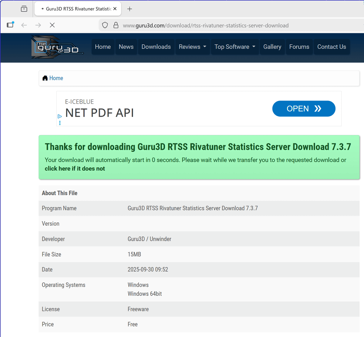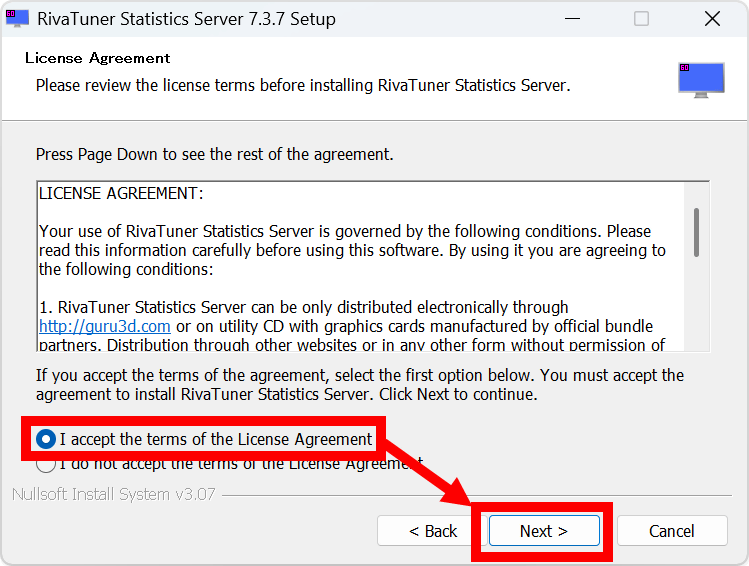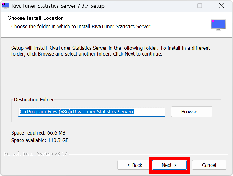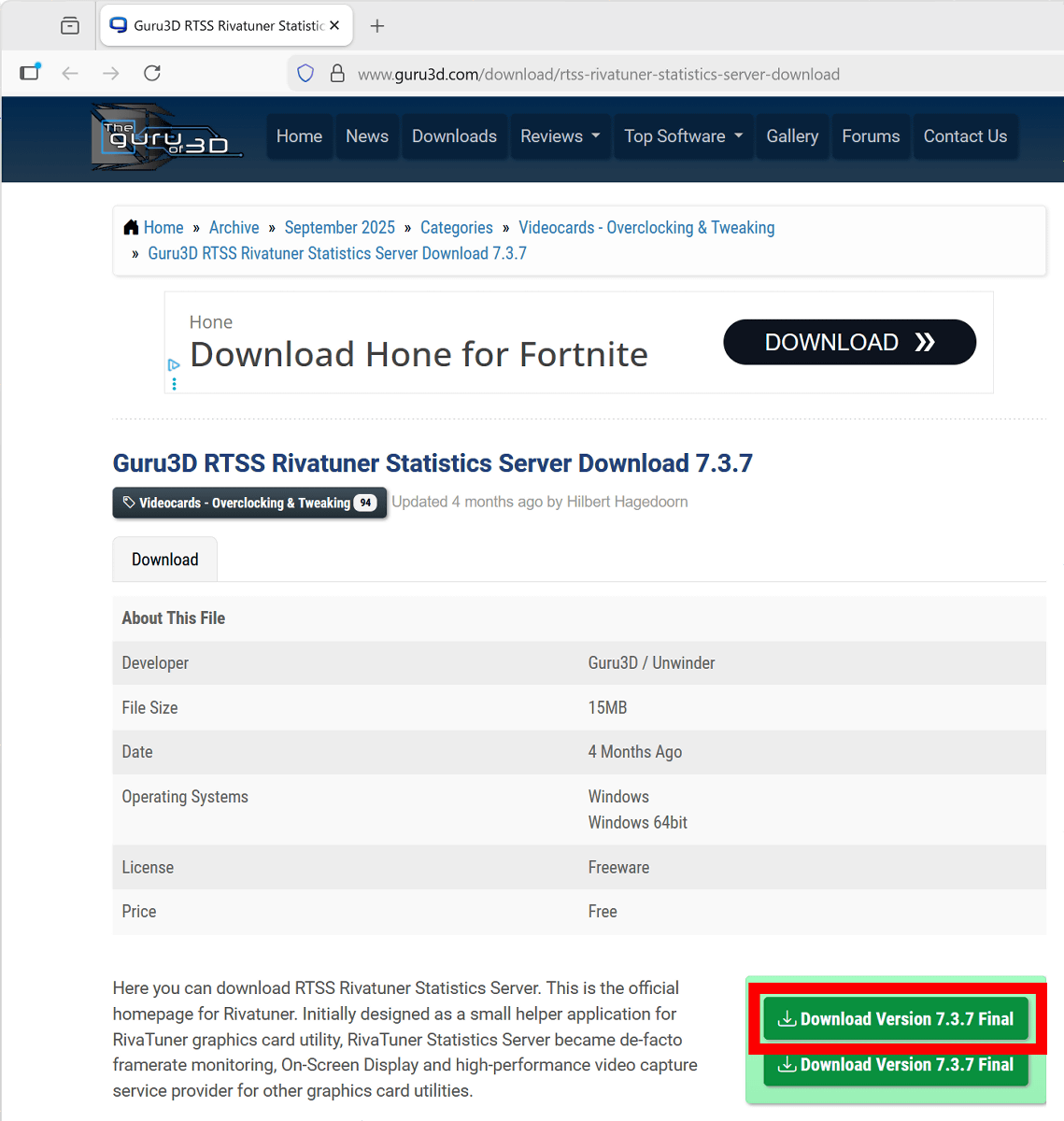 ブラウザが起動してRTSSのダウンロードページが開くので、「Download Version 7.3.7 Final」をクリック。なお、インターネット上にはRTSSの配布ページっぽいサイトが複数存在していますが、マルウェアを含んだアプリが非常に多いため公式ページ(https://www.guru3d.com/download/rtss-rivatuner-statistics-server-download)以外からはダウンロードしないように注意してください。