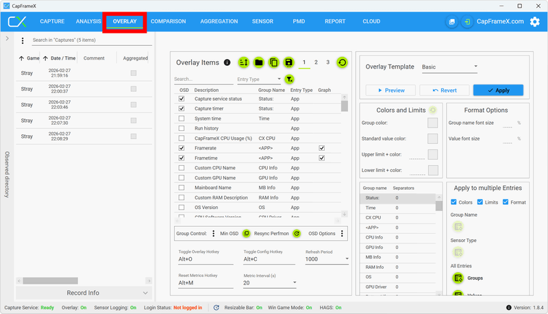 CapFrameXを再起動すると、OVERLAY画面に各種設定項目が表示されています。初期状態でフレームレートやGPU情報などが表示されるようになっています。