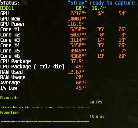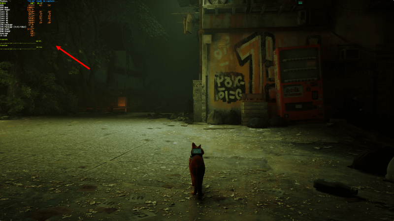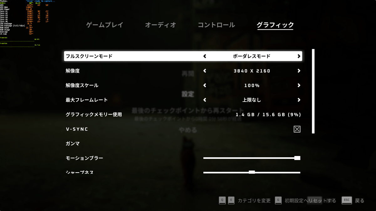 実際にStrayをプレイしてみると、画面の左上に測定結果がオーバーレイ表示されました。