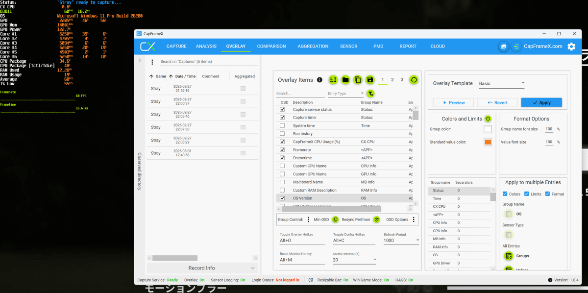 オーバーレイ表示される項目や文字色はCapFrameXのOVERLAY画面でカスタム可能。カスタム結果はオーバーレイ表示にリアルタイムで反映されます。「OSのバージョン」や「CapFrameX自体のCPU消費率」なども表示させることができるので、いろいろカスタムしてみてください。