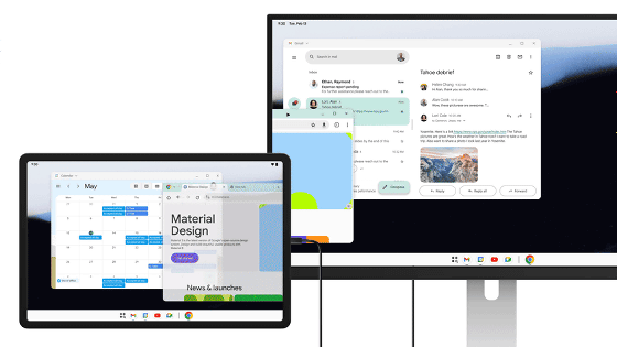 スマートフォンだけでなく折りたたみ式デバイスやタブレットでも外部モニター出力機能を利用可能。Samsung Galaxy Tab S11のような「ウィンドウモードをサポートするデバイス」の場合、外部モニターを拡張画面として扱ってデバイスとモニターの画面をつなげてウィンドウを自由に配置できます。なお、外部モニター出力機能は記事作成時点では「Pixel 8シリーズ」「Pixel 9シリーズ」「Pixel 10シリーズ」「Samsung S26シリーズ」「Samsung Fold7」「Samsung Flip7」「Samsung Tab S11」で利用可能です。