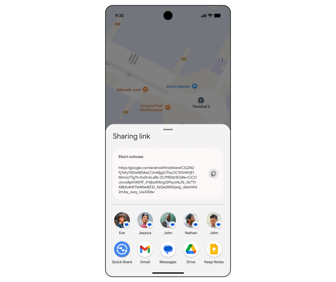デバイスや落とし物タグの位置情報を表示できるFind Hubの新機能として位置情報共有リンク作成機能も追加されました。この機能は空港で荷物を紛失した際に航空会社に位置情報を伝えることを目的に設計されています。