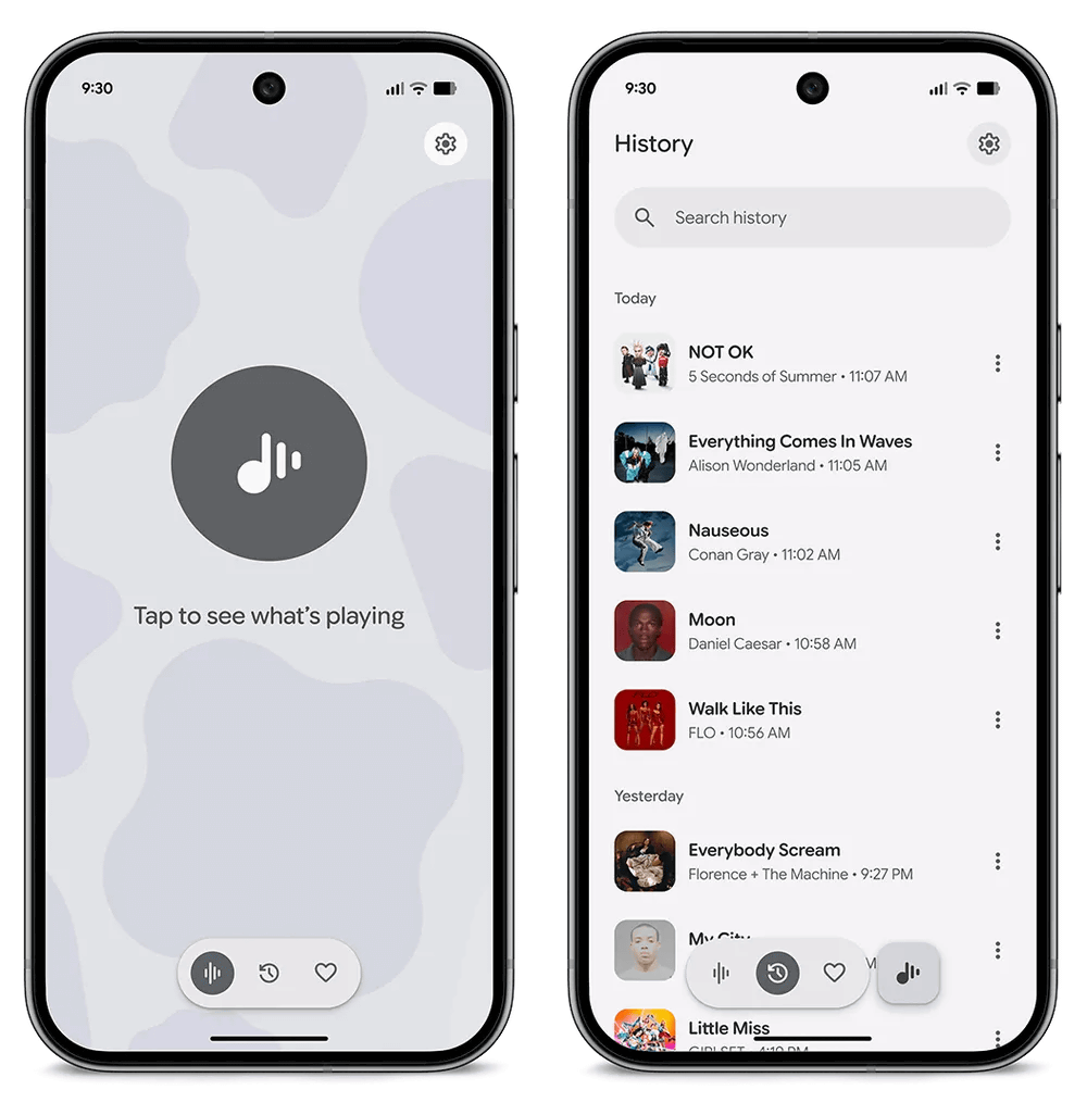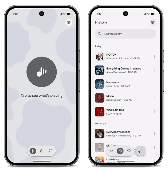 さらに、周囲で流れている音楽の曲名を検索する機能が単一のアプリとして独立しました。これにより、「過去の検索履歴を閲覧する」「楽曲をお気に入り登録する」「アプリ内で楽曲全体を再生する」といった操作が可能になっています。