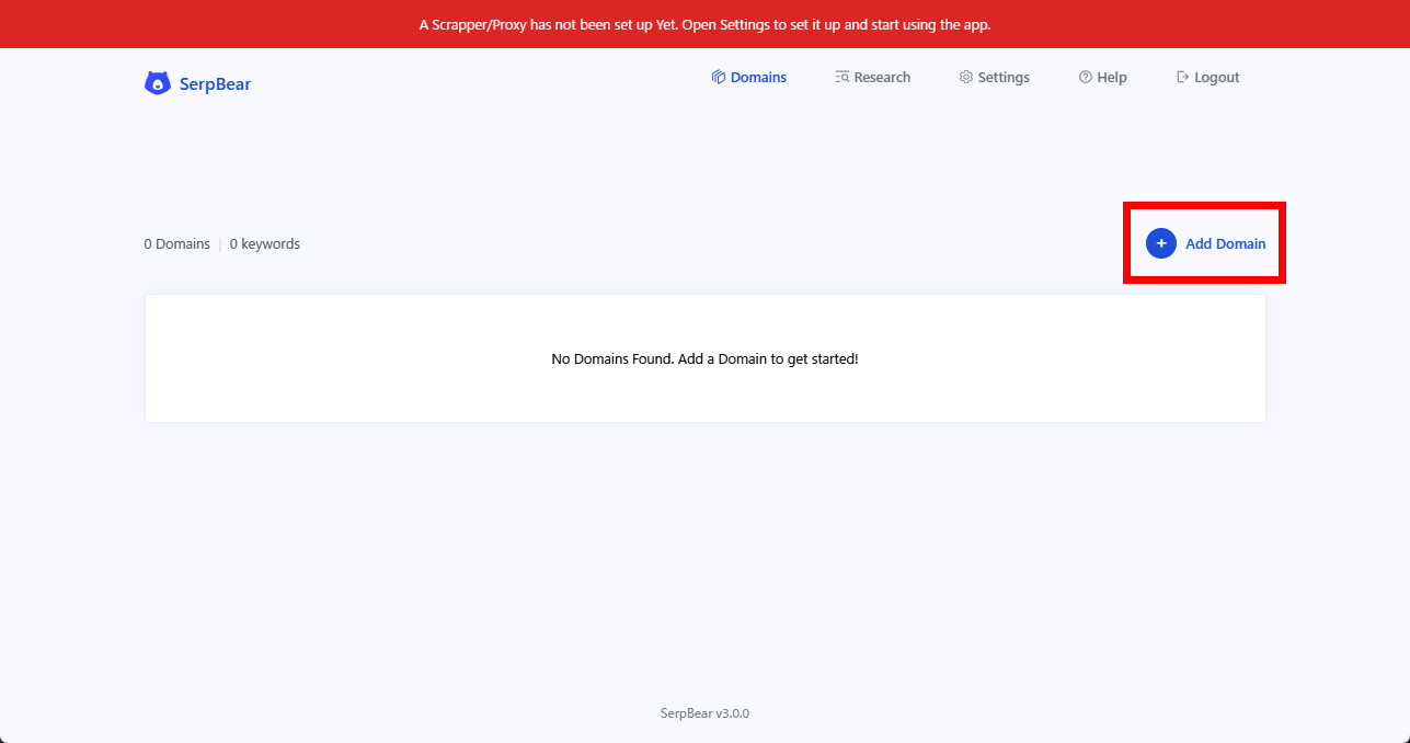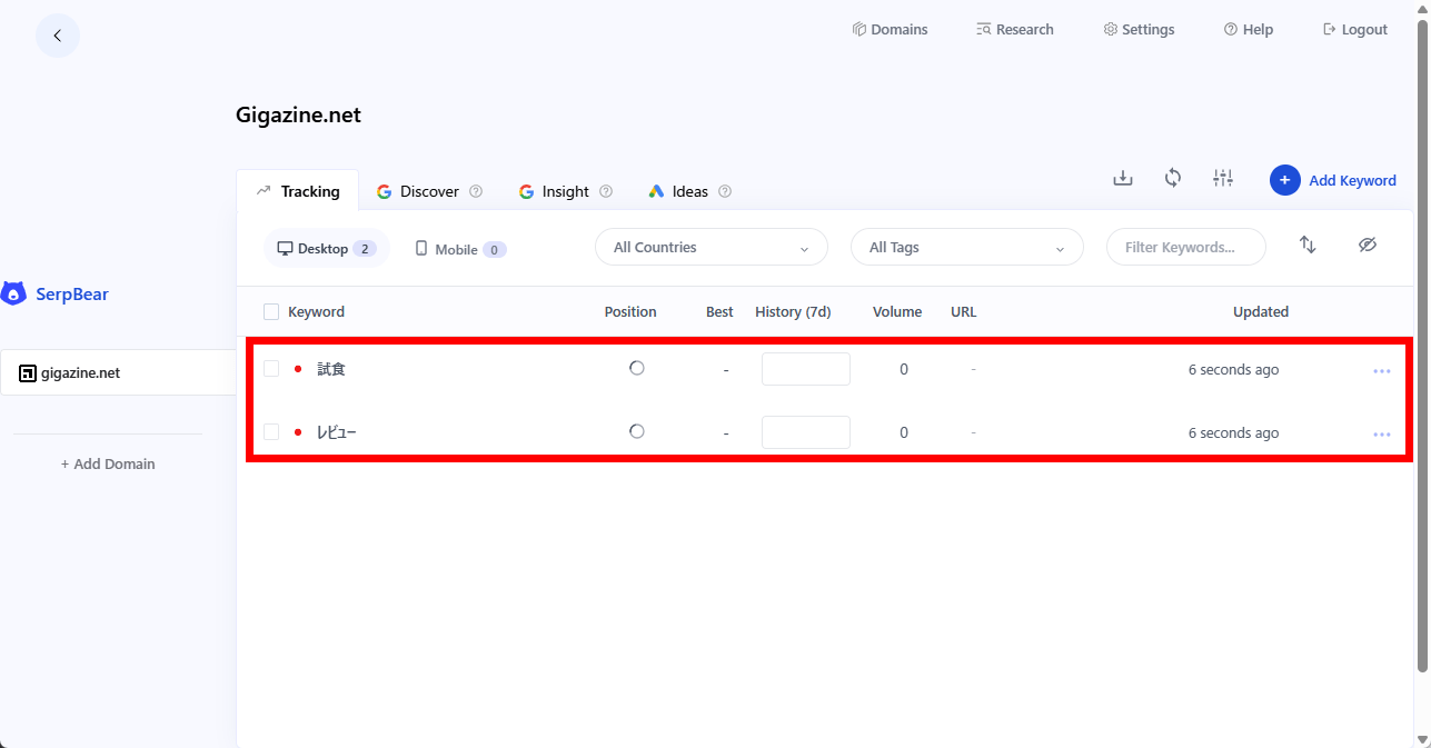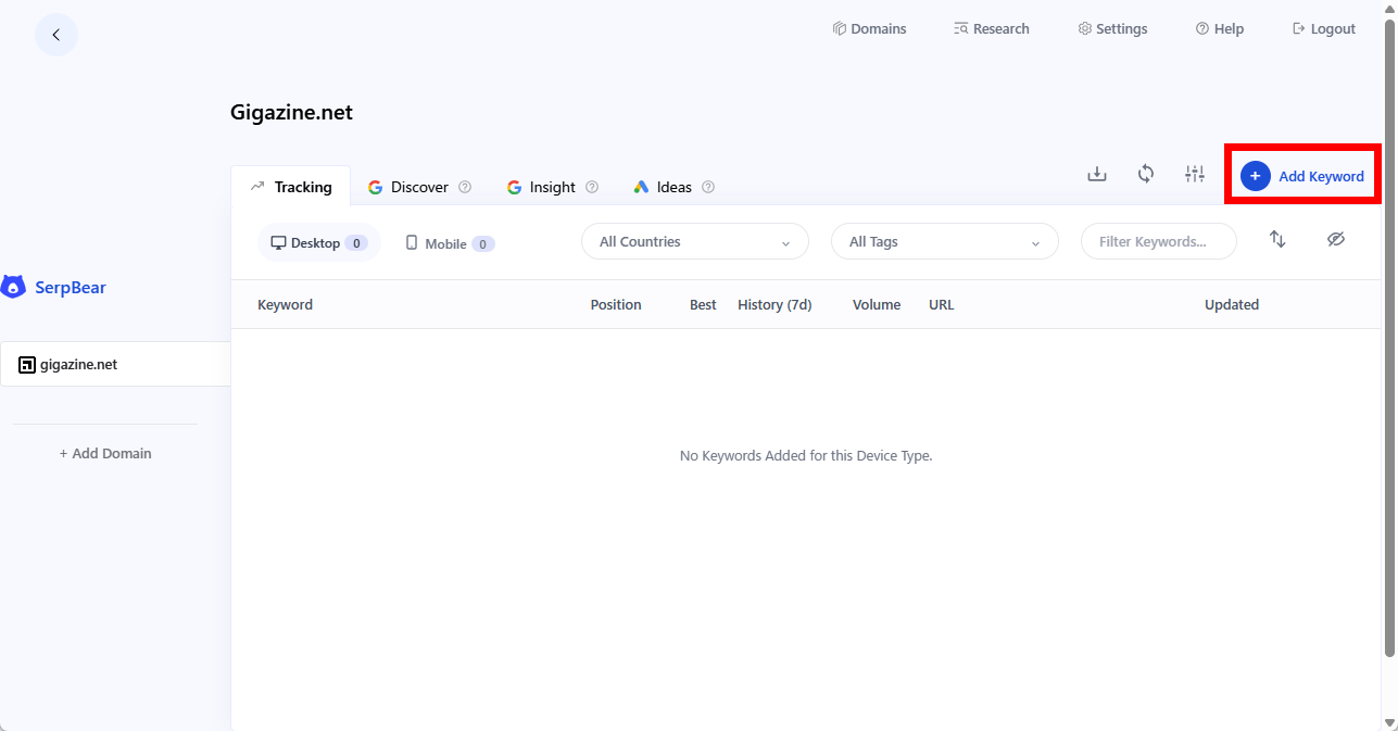ドメイン画面に移動したら「Add Keyword」をクリックし、追跡したいキーワードを入力します。