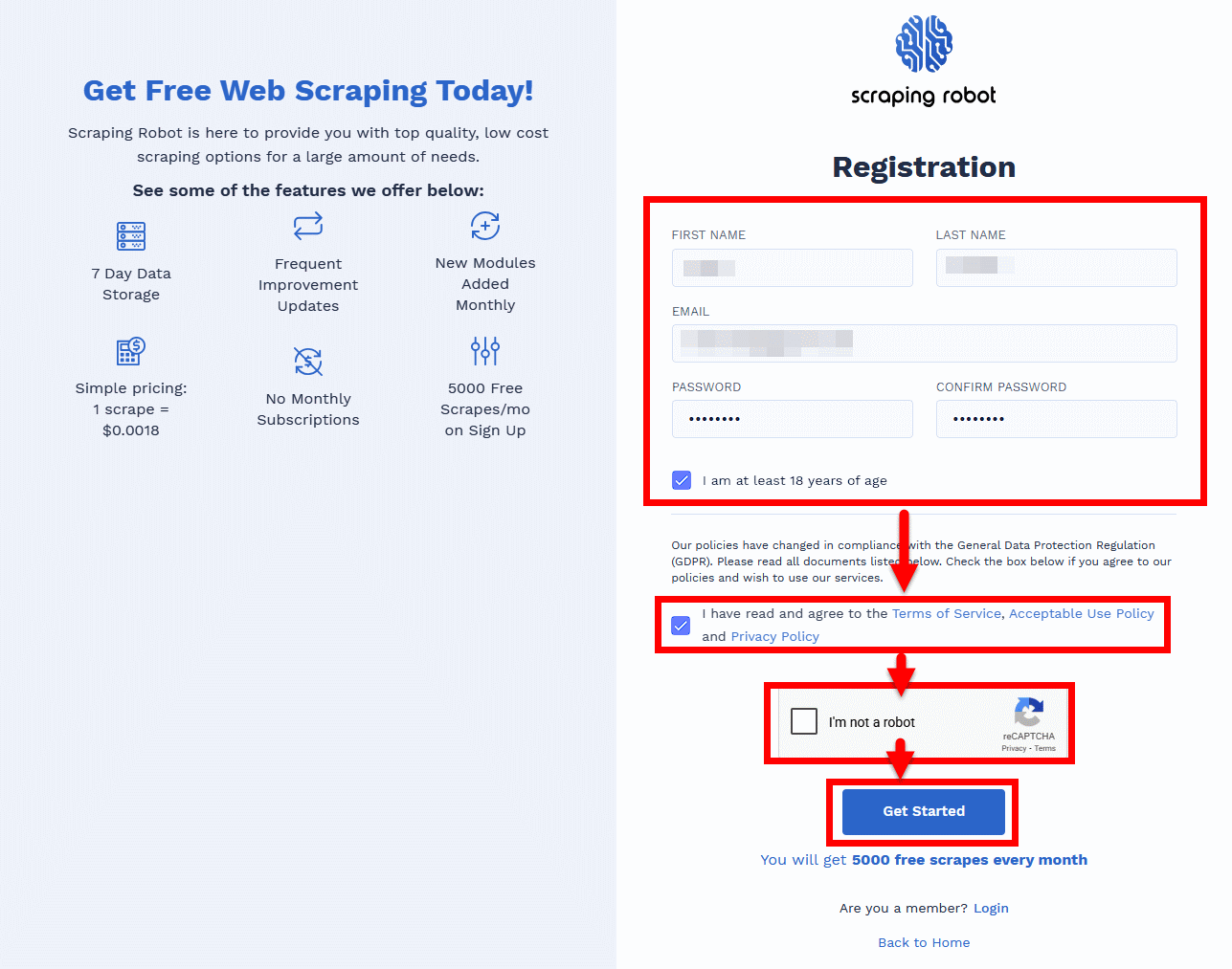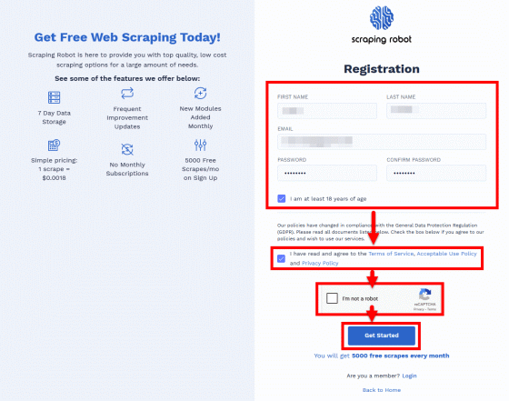 登録フォームで氏名・メールアドレス・パスワードを入力し「I am at least 18 years of age」をチェック、利用規約・利用規定・プライバシーポリシーの同意にチェックしreCAPTCHAを解決して「Get Started」ボタンをクリックすると登録できます。