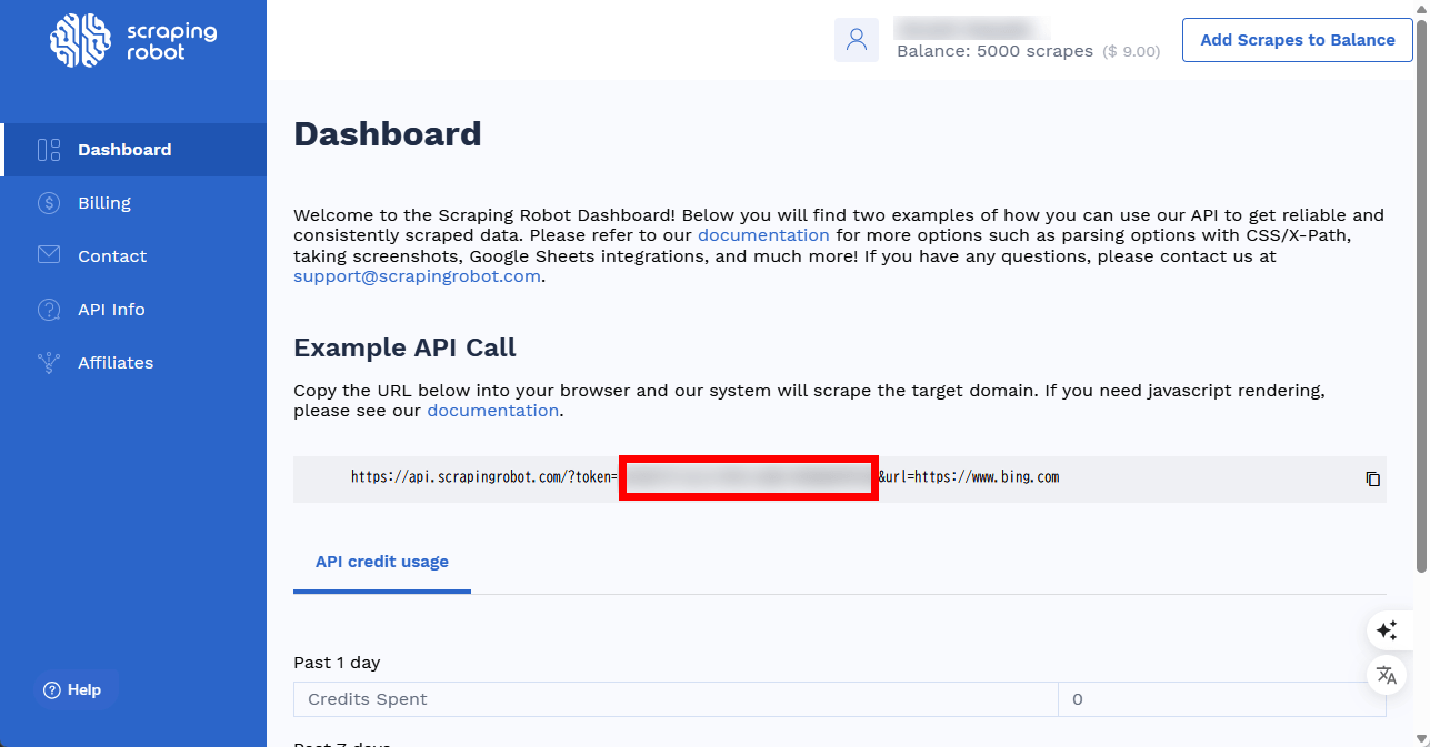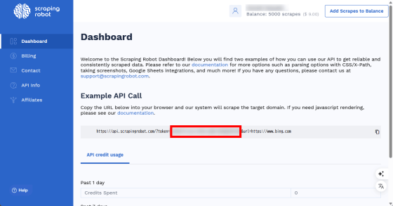 「Dashboard」画面に移動するので、「Exsample API Call」欄に表示されているURLのうち「token=」と「&url=https://www.bing.com」の間にあるUUID形式文字列をトークンとして取得します。