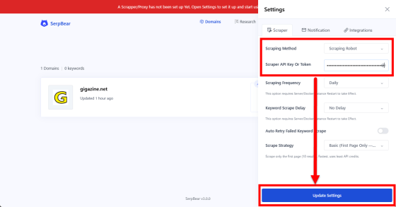 「Scraper」タブの「Scraping Method」で「Scraping Robot」を選択、「Scraper API Key Or Token」に取得したトークンを入力します。それ以外はデフォルトのまま「Update Settings」をクリックすると設定は完了です。