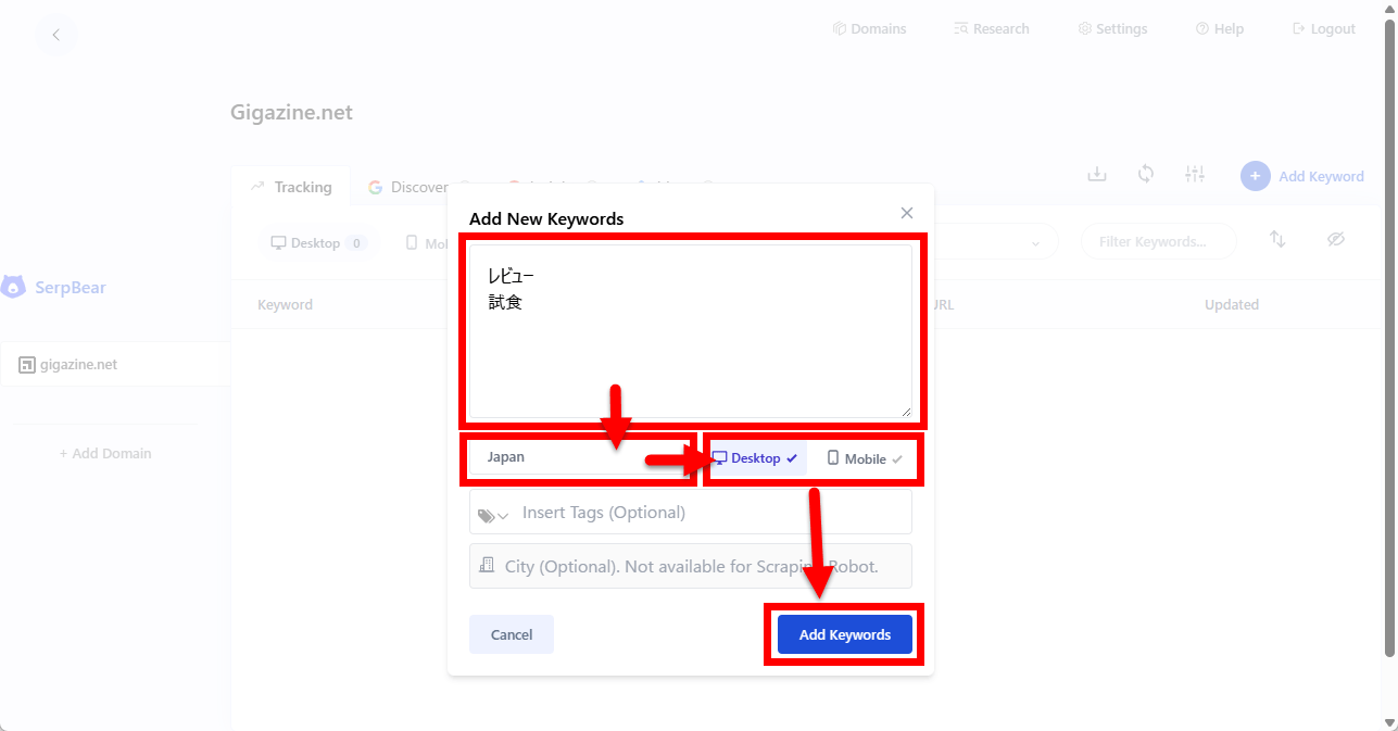「Add New Keywords」ポップアップが表示されたらキーワードを入力し「Japan」を選択、調査対象によって「Desktop」か「Mobile」を選択して「Add Keywords」ボタンをクリックします。