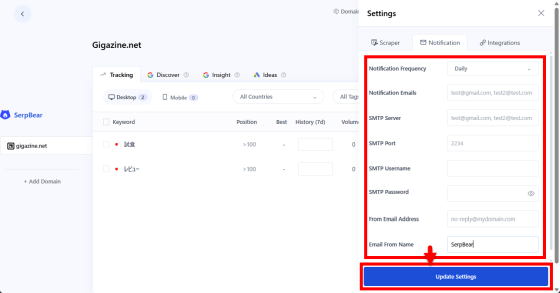 「Settings」でSMTPの設定を行うことによりキーワードの順位をメールで通知できるようになります。「Settings」をクリックし「Notification」タブで「Notification Frequency」を「Never」以外にするとSMTPの設定項目が表示されるようになります。