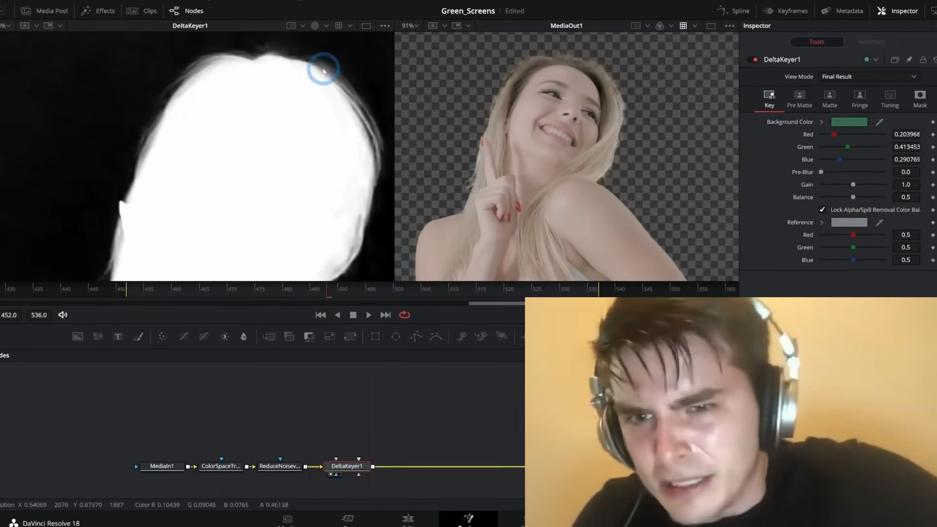 すると、被写体の色とグリーンバックの色が混ざったピクセルが生成されるため、従来のキーヤーでは色を正確に分離するのが難しく、複雑なエッジマットを作成したり、手動でロトスコープ処理を行ったりするのに何時間も費やす必要がありました。