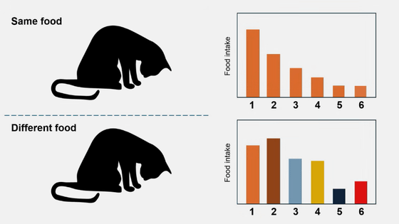 その結果、同じ食べ物を繰り返し与えた条件では摂取量が徐々に減少しましたが、6種類の異なる食べ物を与えるとこの減少は著しく緩和され、累積摂取量が増加しました。また、同じ食べ物を繰り返し与えた後に別の食べ物を与えると、新しい食べ物の嗜好性に関係なく、摂取量が回復したことも観察されています。