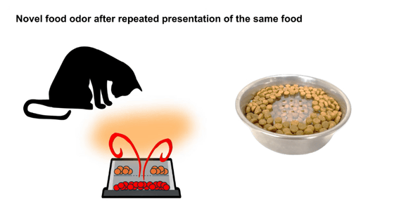 さらに、2つの仕切りがある皿を使って「新しい食べ物の匂い」だけを追加し、食べ物自体は同じものを与え続けた場合でも、新しい食べ物を与えた時と同様の回復が見られました。逆に摂食サイクルの合間に同じ食べ物の匂いに継続的にさらされるとその後の摂食量が抑制されたことから、ネコの少量頻回摂食に関する小食のメカニズムは「匂い」に依存していると研究チームは結論付けています。
