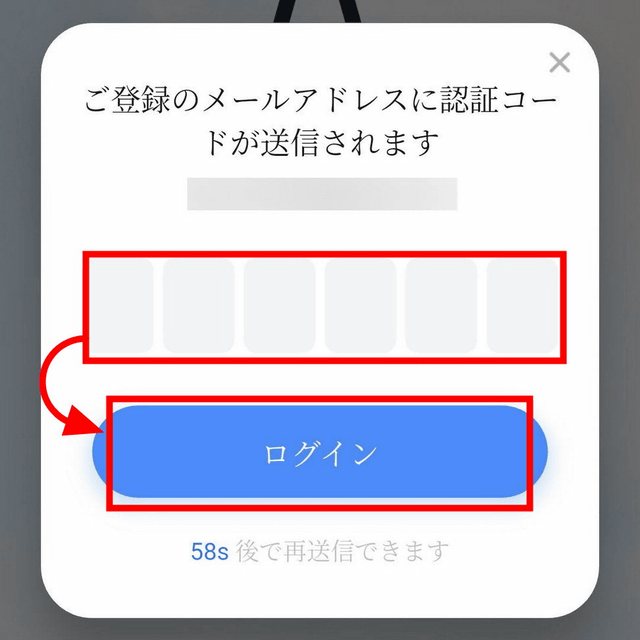 登録したメールアドレスに認証コードとして6桁の数字が送信されるので、アプリの入力欄に認証コードを入力して「ログイン」をタップ。