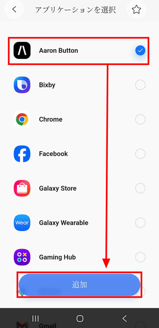「アプリを開く」は、Aaron Buttonを押すだけで任意のアプリを起動できるようになるアクションです。今回はこの「Aaron Button」アプリを選択し、「追加」をタップ。