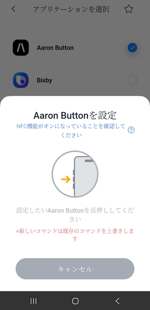 NFCタグをかざすように指示されるので、設定したいAaron Buttonを押します。