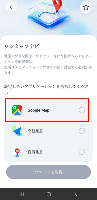 「ワンタップナビ」では地図アプリを連携させます。今回は「Google Map」を選択。