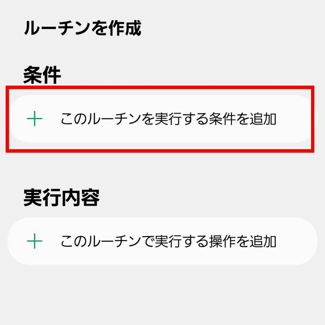 ルーチンの作成画面で、「このルーチンを実行する条件を追加」をタップ。