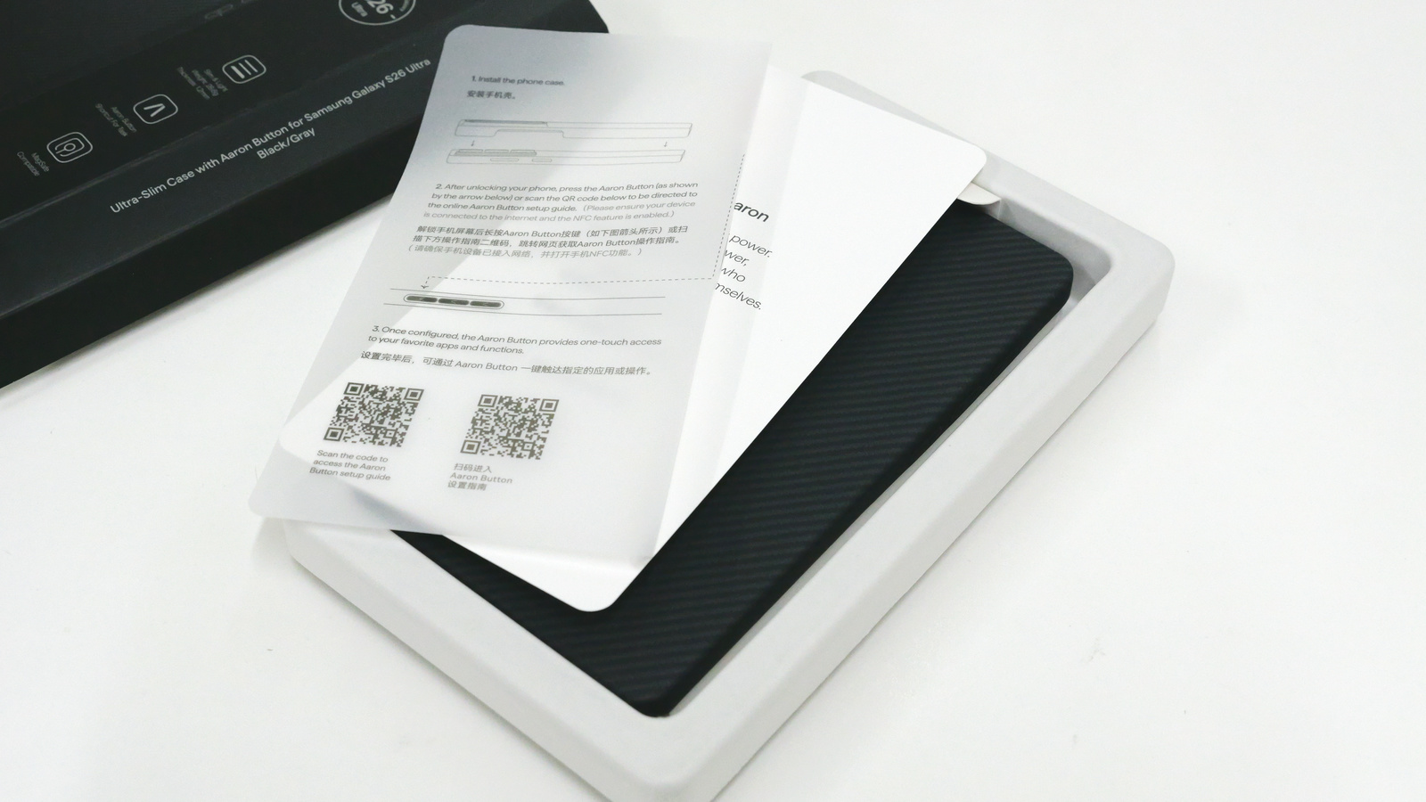 PITAKAのGalaxy S26 Ultra用ケースはアラミド繊維が採用されたタフなケースであるとともに、本体そのものの意匠とイメージを損なわないシンプルなデザインで使いやすいのが特徴。しかし、その真価はケースについているAaron Buttonで、ボタンを押すだけでカメラを起動したり自宅までの帰路を調べたりと、スマートフォンを使いこなす上での機能拡張が可能になります。Aaron Buttonは3つついているので、頻繁に使う機能にアクセスするためのランチャー代わりのハードウェアになります。NFCボタンなので本体からの電源供給は不要。薄型でデザインの邪魔にならないのもうれしいポイントです。