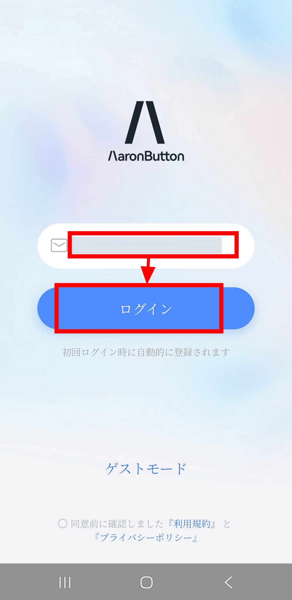 Aaron Buttonアプリを起動。メールアドレスを入力し、ログインをタップします。