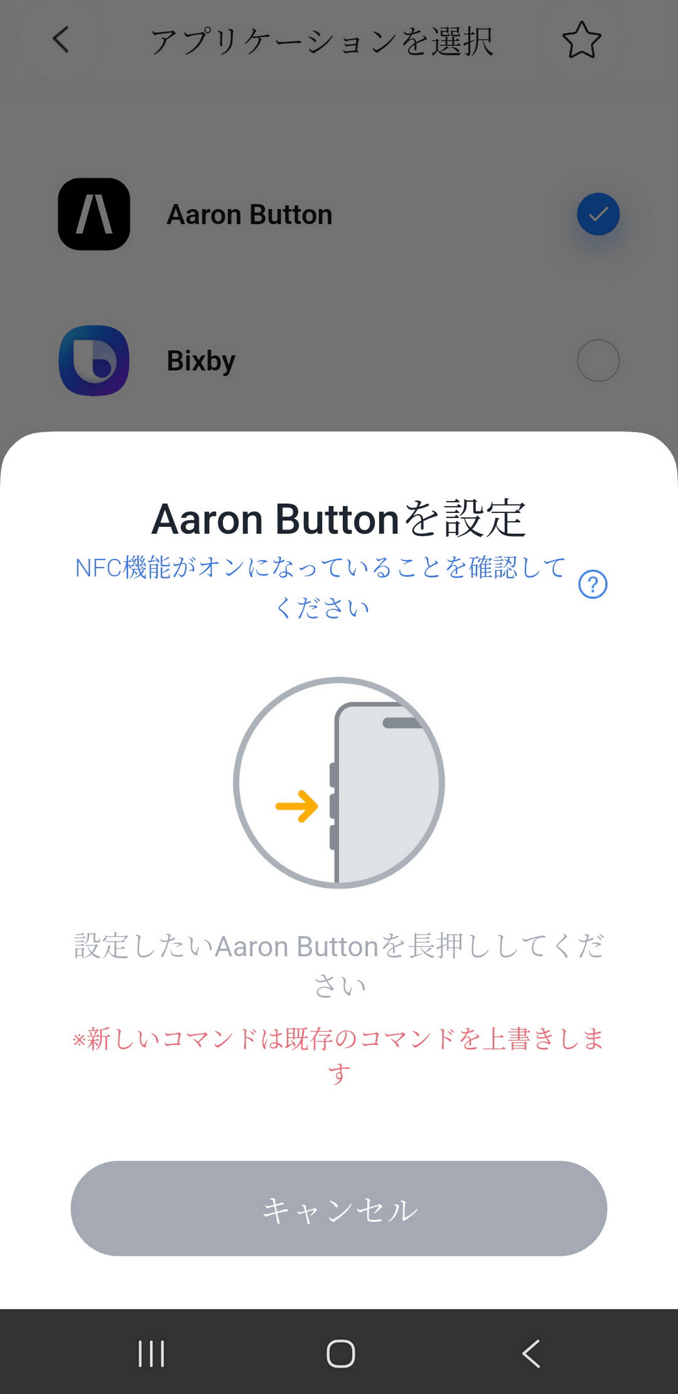 NFCタグをかざすように指示されるので、設定したいAaron Buttonを押します。