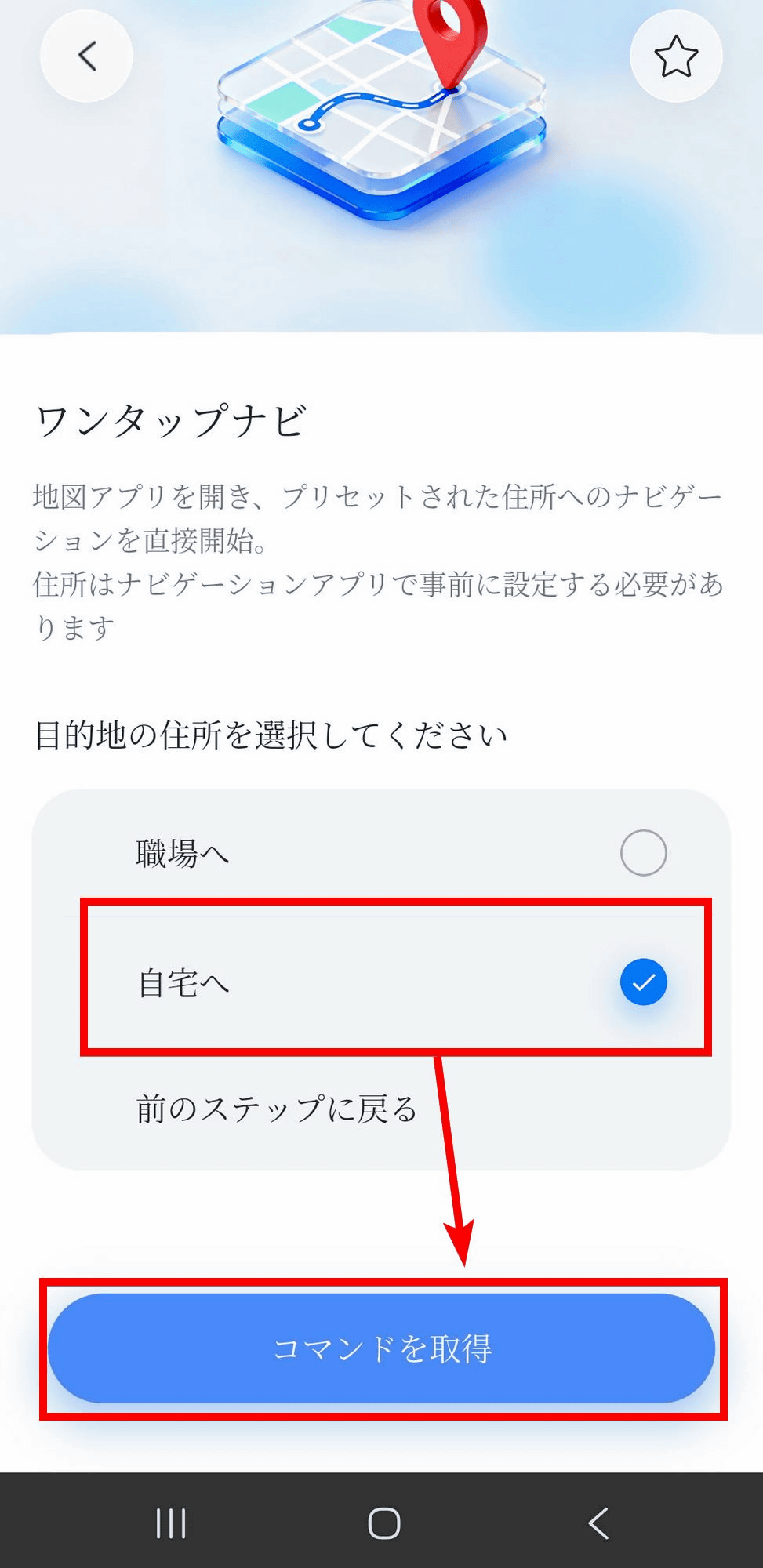 「自宅へ」を選択し、「コマンドを取得」をタップします。
