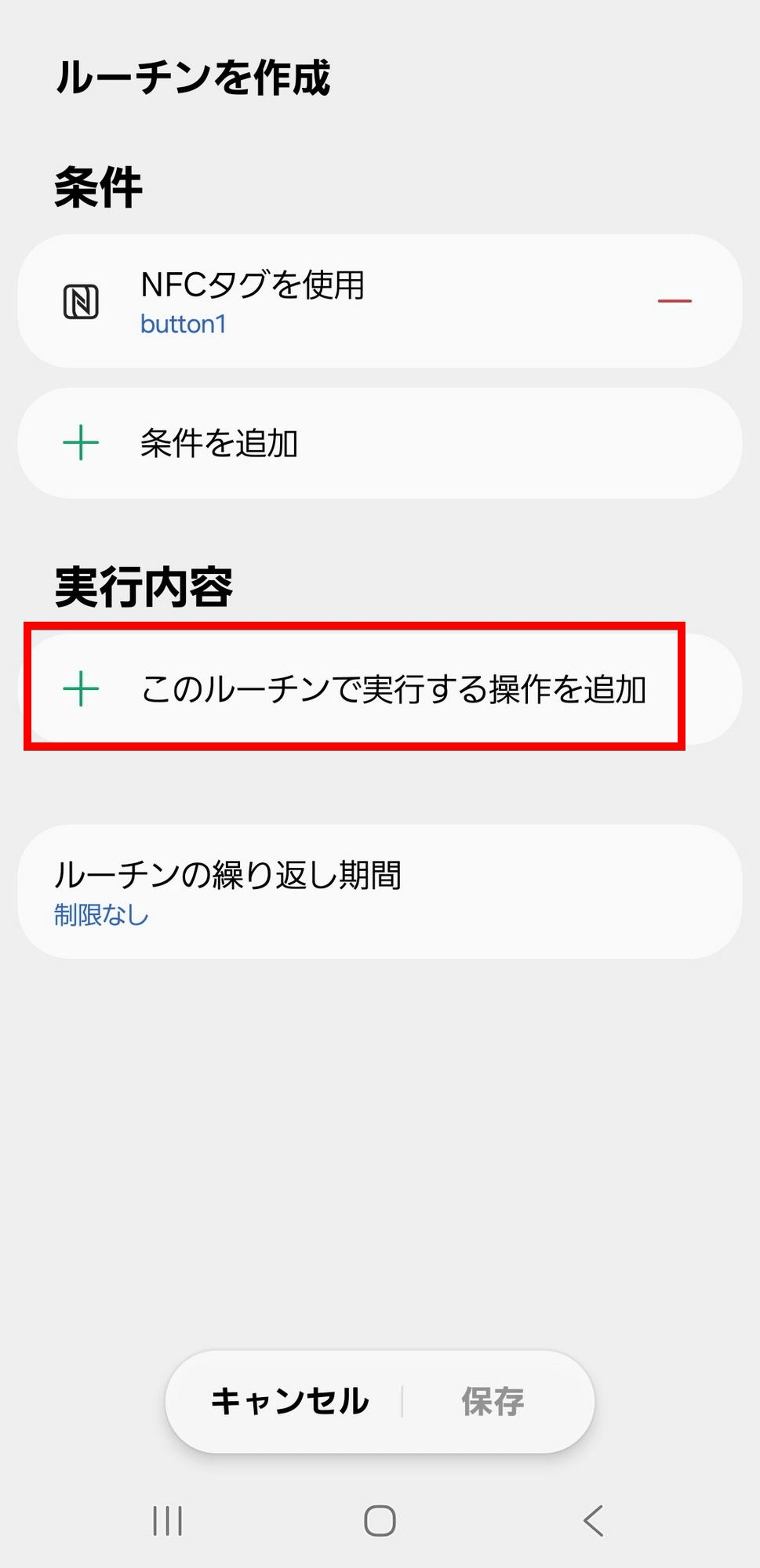 ルーチンの作成画面で、「このルーチンを実行する条件を追加」をタップ。