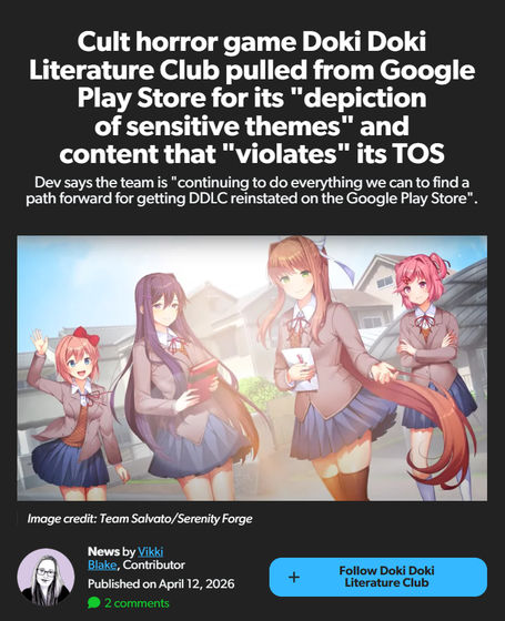 3000万人超にプレイされた海外発の人気ノベルゲー「ドキドキ文芸部!(Doki Doki Literature Club!)」がセンシティブなテーマの描写を理由にGoogle Playから削除される
