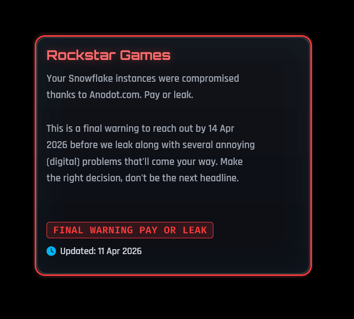 ShinyHuntersは「Rockstar GamesとAnodot.comのおかげで、Rockstar GamesのSnowflakeインスタンスを侵害することができました。身代金を支払うか、情報を漏えいするかのどちらかを選んでください。2026年4月14日までに連絡してください。これが最後の警告です。さもなければ、情報漏えいと、Rockstar Gamesに降りかかるであろう数々の厄介なデジタル問題を引き起こすことになるでしょう。正しい決断を。次の見出しにならないでください」と投稿し、4月14日までに身代金の支払いを要求しています。